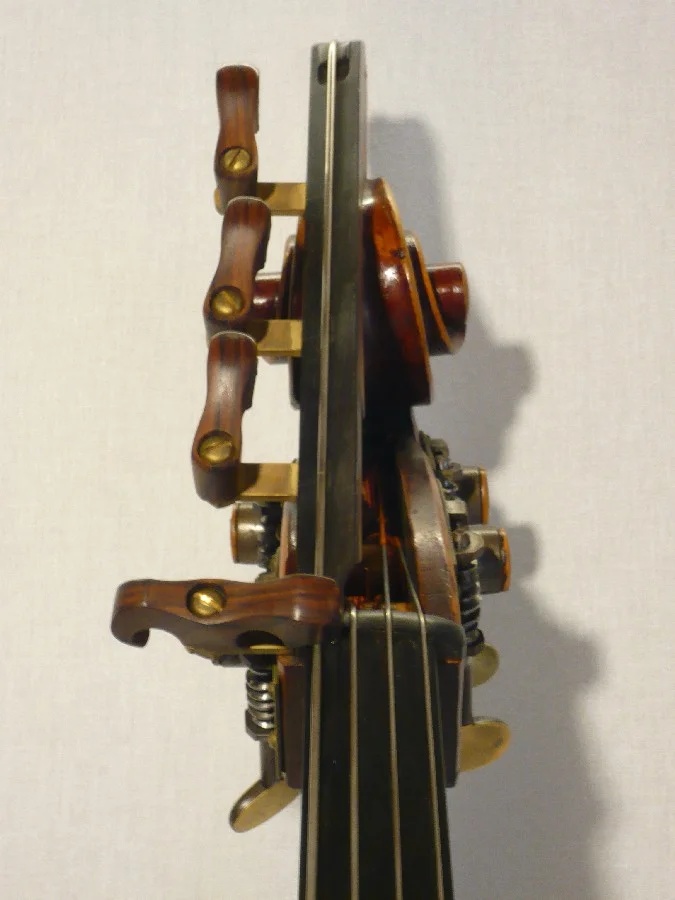 This unlabeled bass is attributed to Jacquet of Mirecourt circa late 1800’s. The flat two-piece maple back marked by a faint irregular figure. The ribs, neck and scroll are of similar maple. The two-piece spruce top has narrow width grain in the center, widening to the flanks. The varnish is red-brown on golden ground in color.