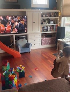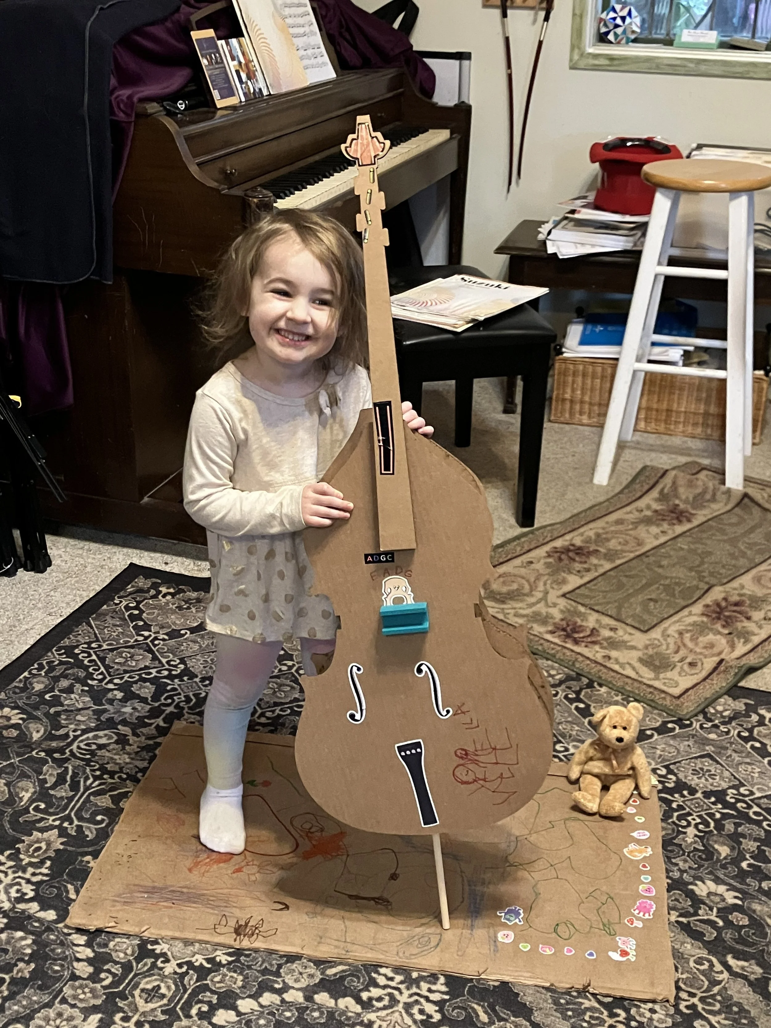 Ella is three years old. We spent her first month of lessons “building” her bass—getting acquainted with the different parts of the instrument and learning how to stand on her foot chart and take a bow. The day she brought her bass home, she was so excited that she asked if she could join the Berlin Philharmonic in their virtual concert hall!